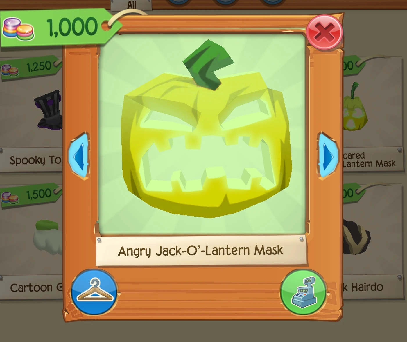 The Angry Jack O' Lantern Mask is a clothing item worn on the head. It was originally released during the Night of the Phantoms on October 21, 2017 at the Traveling Salesman for 1,000 Gems.
