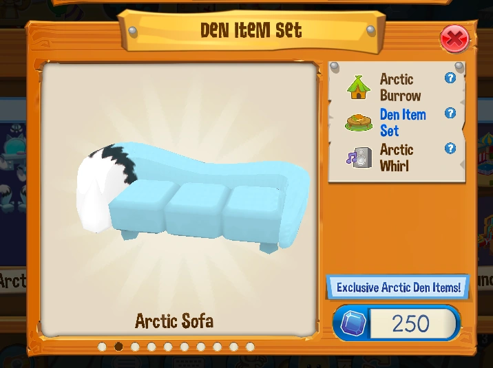 The Arctic Sofa is a den item. It was originally released on November 30th, 2017 at the Sapphire Shop for 250 Sapphires as a part of the Arctic Burrow Bundle.