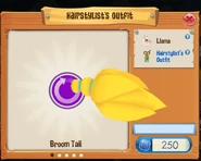 The Broom Tail is a clothing item worn on the tail. It was originally released on August 2, 2018 as part of the Snazzy Llama Bundle for 250 Sapphires or for 20 Sapphires at the Sapphire Shop.