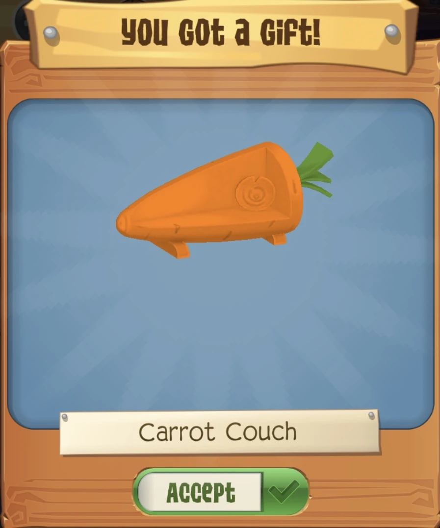 The Carrot Couch is a members-only den item. It was originally released on April 19, 2020, as a Pack Gift in any of the Pack Hideouts.