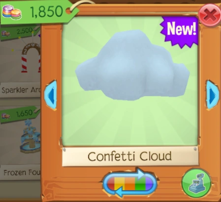 The Confetti Cloud is a den item. It was originally released in December 2019 at Epic Wonders for 1,850 Gems.