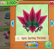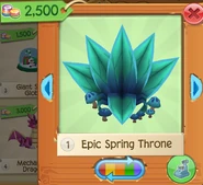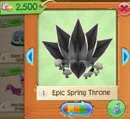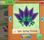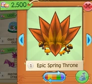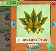 The Epic Spring Throne is a den item. It was originally released in June 2016 at Epic Wonders for 2,500 Gems.