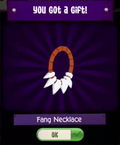 The Fang Necklace is a clothing item worn around the neck. It was originally released during the Night of the Phantoms in October 2015 through the Super Sweets Minigame.