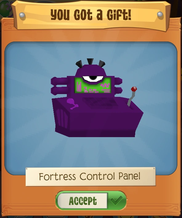 The Fortress Control Panel is a members-only den item. It was originally released during Night of the Phantoms on October 13, 2019, as a Pack Gift in the Pack Hideouts.