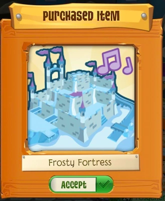 The Frosty Fortress is a den item. It was originally released on January 15, 2020 at the Sapphire Shop for 25 Sapphires or with the Snow Fortress Bundle for 250 Sapphires.