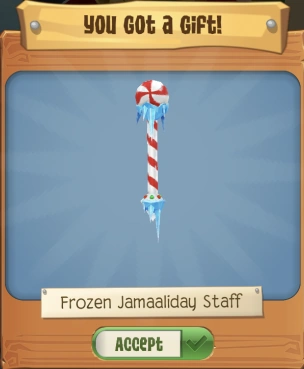 The Frozen Jamaaliday Staff is a clothing item worn on the back. It was originally released on December 8, 2020 as the eighth gift in the Jamaaliday Gift Calendar.