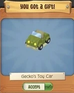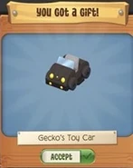 The Gecko's Toy Car is one of the Pet Gecko's pet den items. This item was originally released on May 31, 2020 as a gift from the Monthly Login Gifts for logging in 31 times during May.