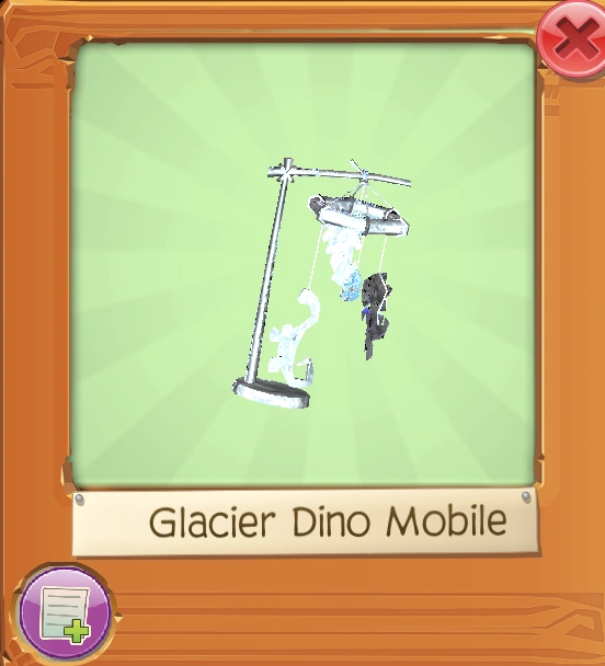 The Glacier Dino Mobile is a den item. It was originally released on February 14, 2024, at the Sapphire Shop through the Super Box for $3.99 USD or $9.99 USD for the larger bundle.