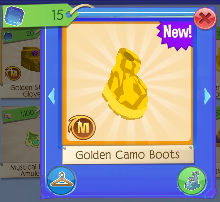 The Golden Camo Boots are a members-only clothing item worn on the paws. It was originally released on November 15, 2019, at the Traveling Salesman for 15 Sapphires.