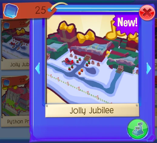 The Jolly Jubilee is a den item. It was originally released on December 4, 2019 at the Sapphire Shop for 25 Sapphires or with the Jamaaliday Gift Palace Bundle for 250 Sapphires.