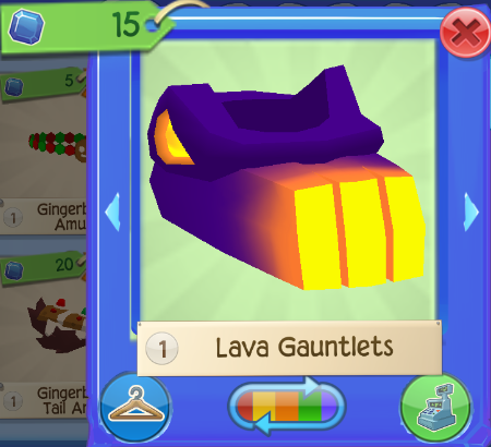 The Lava Gauntlets is a clothing item worn on the paws. They were originally released in October 2016 at Sapphire Shop for 15 Sapphires.
