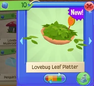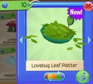 The Lovebug's Leaf Platter is one of the Lovebug's pet den Item. It was originally released during the Friendship Festival in February 2017 at Claws 'N Paws for 10 Sapphires and also through the Friendship Cottage Bundle at Sapphire Shop for 250 Sapphires.