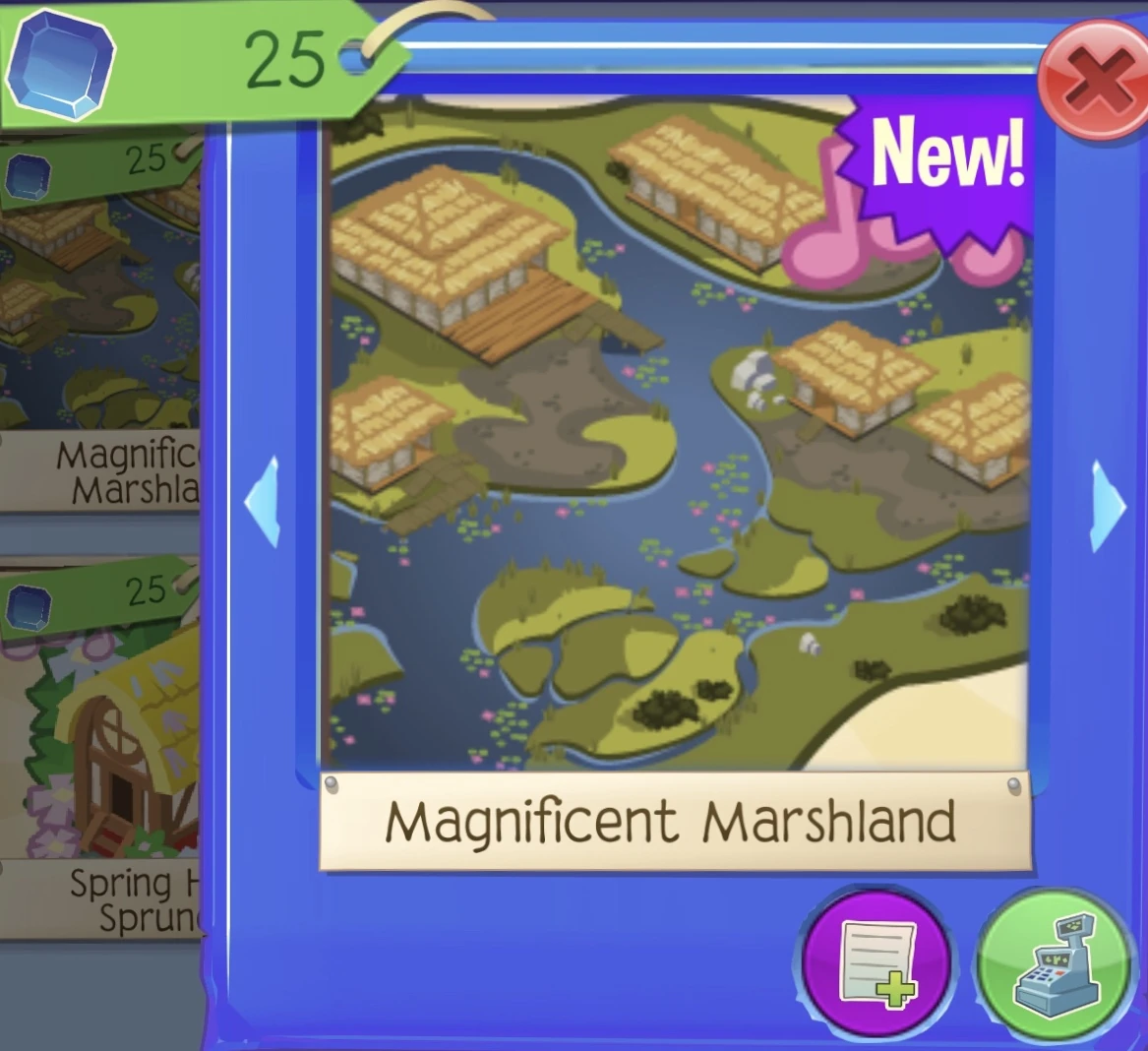The Magnificent Marshland is a music den item. It was originally released on June 17, 2020 at the Sapphire Shop for 25 Sapphires or with the Sub-Saharan Marshland Bundle for 250 Sapphires.
