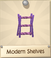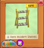 Not to be confused with the Modern Shelves/Leilani. The Rare Modern Shelves is a den item. It was originally released in the Beta Testing at Jam Mart Furniture for 500 Gems.