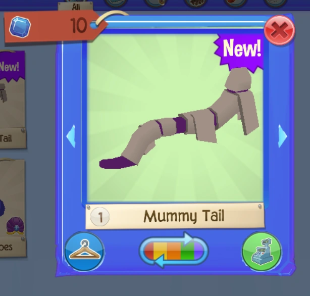 The Mummy Tail is a clothing item worn on the tail that was released on October 17, 2017, in the Sapphire Shop for 10 Sapphires.