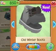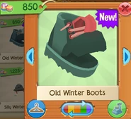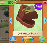 The Old Winter Boots is a clothing item worn on the paws. It was originally released in February 2017 at Shiveer Shoppe for 850 Gems.