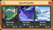 Each pet has a favorite type of location. Sending your pet to a location it likes will result in a higher chance of receiving a prize item, and it is rumored that if a 5-day expedition, an Exotic Pet DNA Vial will yield high chances. When a pet is sent to its favorite location, it is indicated by the pet thinking of a heart eyes emoji. Sending it to a "wrong" location will result in a smiley face emoji.