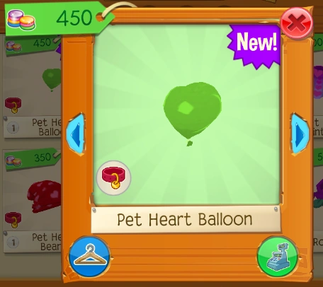 The Heart Balloon is a clothing item worn on the back of a pet. It was originally released in February, 2018 at Claws 'N Paws for 450 Gems.