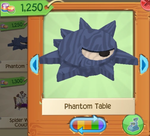 The Phantom Table is a den item. It was originally released during the Night of the Phantoms in October 2015 at Jam Mart Furniture for 1,250 Gems.