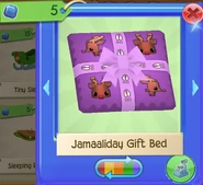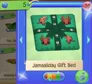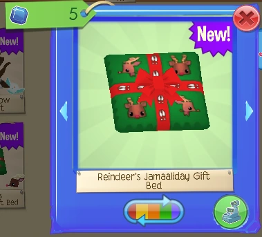 The Reindeer's Jamaaliday Gift Bed is one of the Reindeer's pet den items. It was originally released during Jamaalidays in December 2016 at Claws 'N Paws for 5 Sapphires and also at Sapphire Shop through the Jamaaliday Den Bundle for 250 Sapphires.