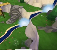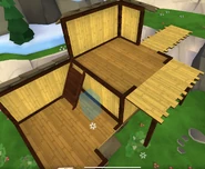 The Shamrock Basin is a mountain with a tiny home, and a creek. It seems to either have winter coming, or leaving, due to the snow around it. There are many tall trees. It seems to be located in Ireland. If you go up the house, you can see a balcony-type area, and you can also go up a bridge to a mountain peak, where stone steps lead down (and up) and where you can walk across the river.