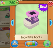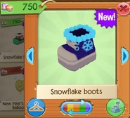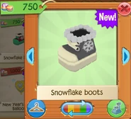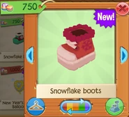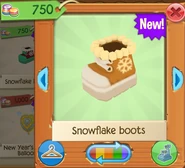 Snowflake Boots are clothing items that are worn on the paws. It was originally released in December 2015 at Jam Mart Clothing for 750 Gems.