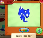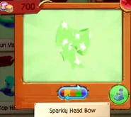 The Sparkly Head Bow is a tied ribbon bow with white stars printed on it. It has an animation; it sparkles continuously. Regardless to the color of the bow, the sparkles are always bright green.