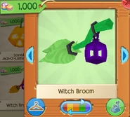 The Witch Broom is a clothing item worn on the back. It was originally released during the Night of the Phantoms in October 2015 at Jam Mart Clothing for 1,000 Gems.